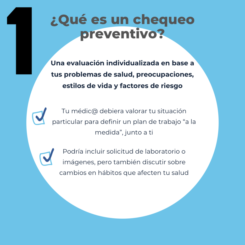 ¿Qué es (o debiera ser) una consulta de chequeo preventivo? El control preventivo debiera consistir en una evaluación individualizada en base a tus problemas de salud, preocupaciones, estilos de vida y factores de riesgo. En base a ello junto a tu médic@ debieran definir un plan de trabajo a la medida.
