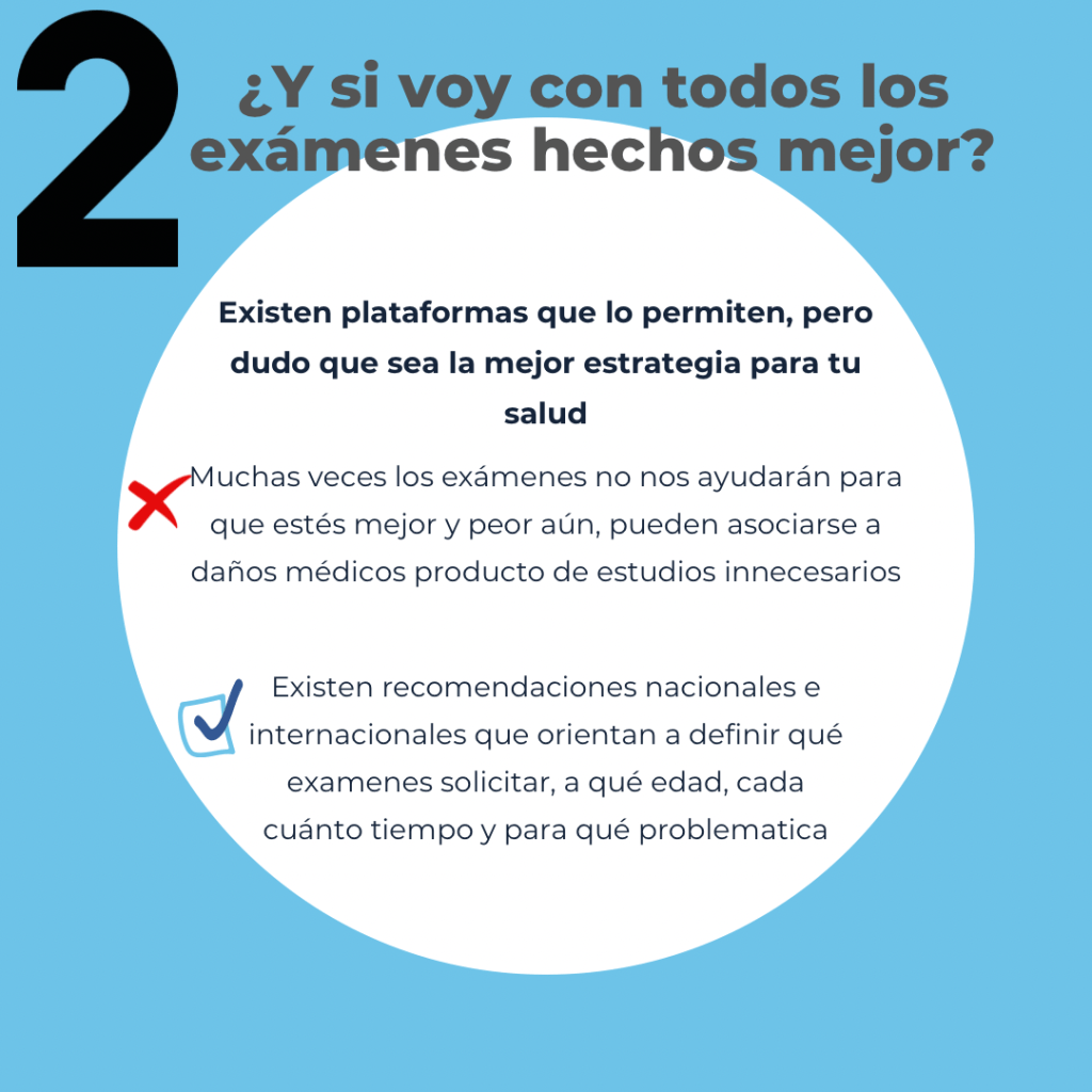 ¿No es mejor acaso llegar con todos los exámenes hechos? Existen plataformas que permiten seguir esta ruta, pero me parece una estrategia riesgosa: muchas veces realizar más exámenes no implica mejor salud, todo lo contrario, puede relacionarse a daños producto de estudios innecesarios.
