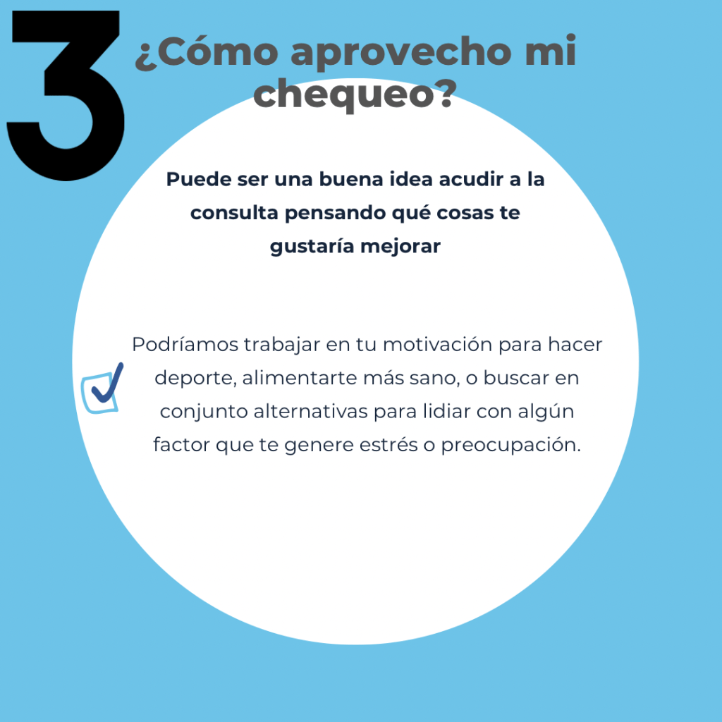 ¿Cómo aprovecho mi chequeo? Creo que es ideal si vienes con una idea general de qué áreas te preocupan. A veces no pensamos directamente en ello, pero la actividad laboral, las relaciones familiares, la alimentación, la actividad física entre otras variables pueden tener gran incidencia en nuestra salud, y en una consulta de chequeo podemos discutir esos temas y valorar espacios de mejora.