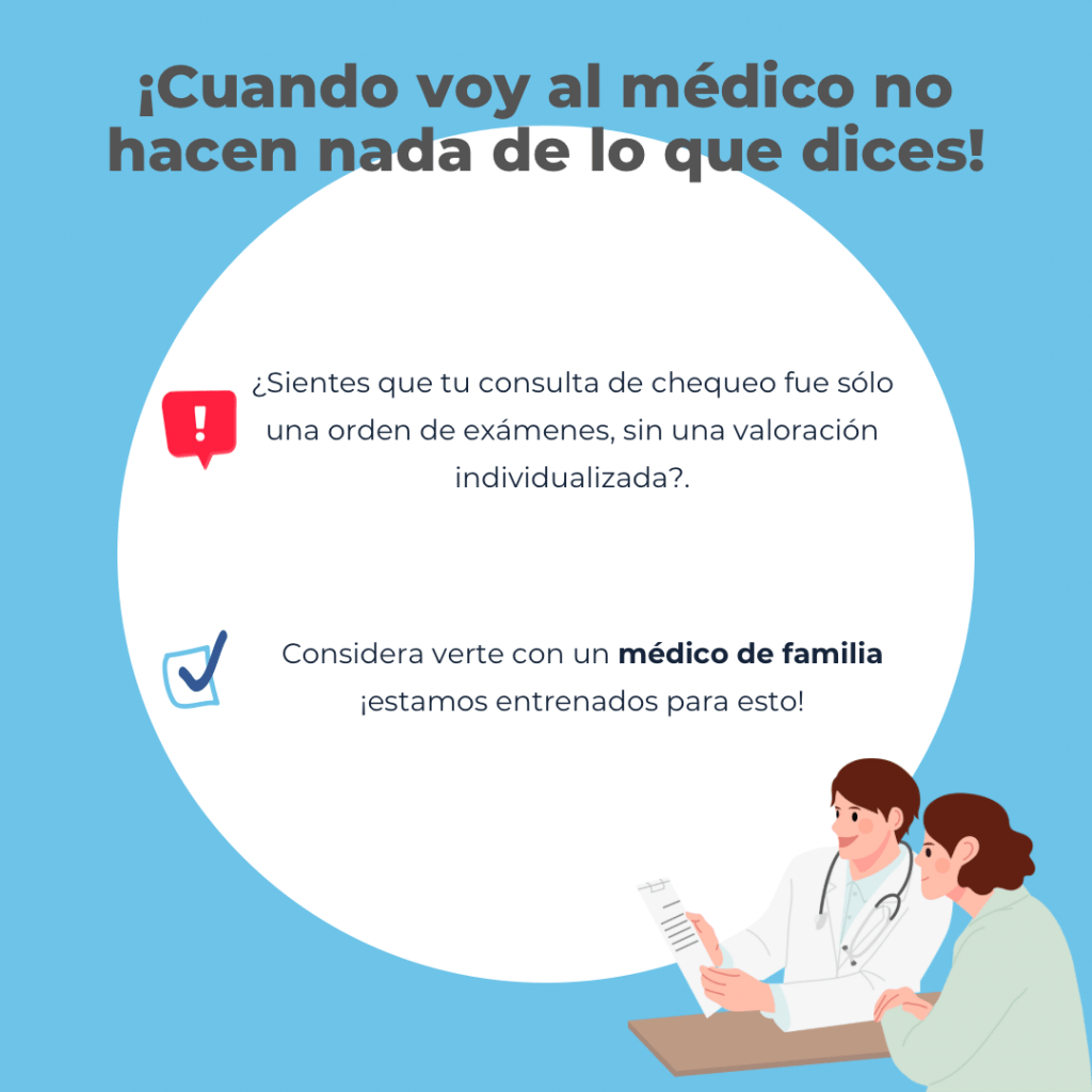 ¿Has tenido alguna experiencia poco satisfactoria en tu chequeo? Lamentablemente muchas veces me han comentado que su consulta de chequeo ha sido sólo una entrega de exámenes, y la consulta de control de los mismos no mucho más. Te recomiendo considerar que tu chequeo lo hagas con un médico de familia, que te conozca y puedan generar una relación a lo largo de los años, que ayude a promover tu salud, pesquisar de mejor forma tus problemáticas, y a lograr mejores soluciones.